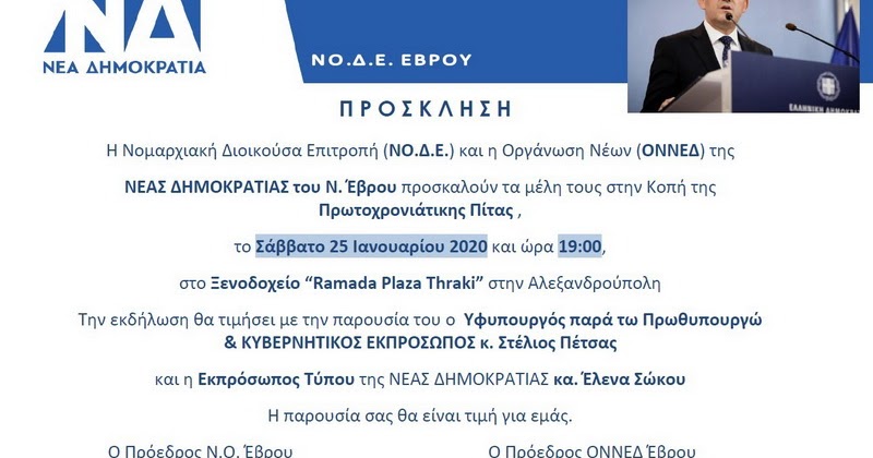 Αντιπροσωπεία της Νέας Δημοκρατίας, αποτελούμενη από τον γραμματέα της Πολιτικής Επιτροπής του κόμματος, Γιώργο Στεργίου, τον γραμματέα Οργανωτικού, Στέλιο Κονταδάκη, τον πρόεδρο της ΟΝΝΕΔ, Παύλο Μαρινάκη, τον πρόεδρο της ΝΟΔΕ Έβρου, ‘Ακη Παρασκευόπουλο, μέλη της Πολιτικής Επιτροπής και μέλη της ΝΟΔΕ Έβρου, θα επισκεφτεί αύριο, Παρασκευή 6 Μαρτίου, το Τελωνείο των Καστανέων, καθώς και την […]