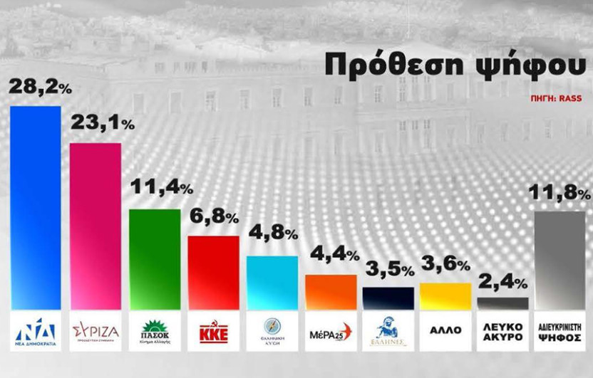 Στη δημοσκόπηση της εταιρείας RASS για το Action 24, η διαφορά της Νέας Δημοκρατίας και ΣΥΡΙΖΑ βρίσκεται στις 5,1 μονάδες. Η έρευνα πραγματοποιήθηκε μετά την ανακοίνωση της ημερομηνίας (21 Μαΐου) διεξαγωγής των εκλογών. Στην πρόθεση ψήφου η Νέα Δημοκρατία συγκεντρώνει 28,2%, ο ΣΥΡΙΖΑ 23,1%, το ΠΑΣΟΚ 11,4%, το ΚΚΕ 6,8%, η Ελληνική Λύση 4,8%, το ΜέΡΑ 25 4,4%, Έλληνες 3,5%, άλλο 3,6%, λευκό – άκυρο 2,4%, αδιευκρίνιστη ψήφος 11,8%. Στο ερώτημα ποιος είναι καταλληλότερος για πρωθυπουργός, οι ψηφοφόροι απάντησαν με ποσοστό 42,9% τον Κυριάκο Μητσοτάκη, με 26,5% τον Αλέξη Τσίπρα, «κανένας» απάντησε το 28,85%, ενώ το 1,8% ΔΓ/ΔΑ. Οι ψηφοφόροι ρωτήθηκαν «με ποιο κόμμα στο τιμόνι της χώρας αισθ