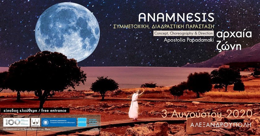 Συμμετοχική διαδραστική παράσταση Χορού, Μουσικής και Λόγου θα πραγματοποιηθεί τη Δευτέρα 3 Αυγούστου 2020 στις 19:00 στον αρχαιολογικό χώρο της Αρχαίας Ζώνης (Μεσημβρία) στην Αλεξανδρούπολη. Το πολυπρισματικό σύμπαν της δημιουργού «συναντά» την γενέθλια γη της, την Αλεξανδρούπολη, σε έναν από τους πιο μαγευτικούς χώρους της χώρας μας, στην πολυπολιτισμική Ζώνη. Η Αποστολία Παπαδαμάκη συνομιλεί με την εποχή, τη στιγμή και την Ιστορία, αντλεί έμπνευση από την αρχαία πόλη που είχε διάρκεια ζωής περισσότερο από τέσσερις χιλιετίες και μας καλεί να θυμηθούμε την καλλιέργεια της ειρήνης, της ισότητας, τη αρμονικής συνύπαρξης, της αλληλοκατανόησης και της κοινωνικής συνοχής, αξίες και έννοιες που διαμό