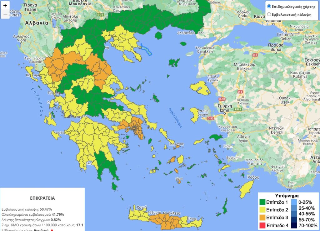 Το ποσοστό θετικότητας, λόγω του τουριστικού κύματος, βρίσκεται στο 3,15%, με περιοχές όπως η Μύκονος και το Ρέθυμνο να ξεπερνούν το μέσο όρο της επικράτειας, με 3,31% και 3,,69% αντίστοιχα.