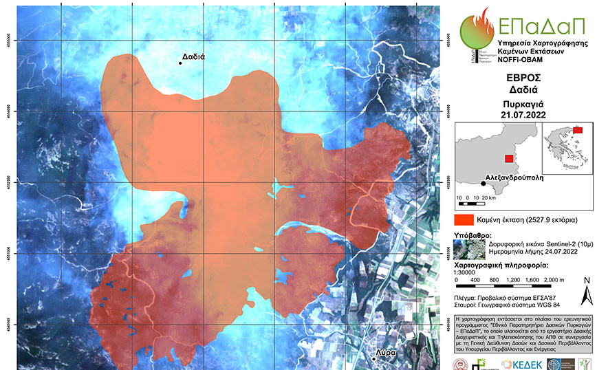 Η φωτιά που ξέσπασε στον Έβρο έχει κάψει μέχρι στιγμής περισσότερα από 25.000 στρέμματα, με την περιβαλλοντική καταστροφή να μην είναι ανείπωτη μόνο στην συγκεκριμένη περιοχή, αλλά και Βατερά της Λέσβου. Η υπηρεσία NOFFi-OBAM του Εθνικού Παρατηρητηρίου Δασικών Πυρκαγιών (ΕπαΔαΠ) παρήγαγε χάρτες που αποτυπώνουν το μέγεθος της τραγωδίας και δείχνουν ότι , στην πυρκαγιά στη Δαδιά Έβρου (ημερομηνία έναρξης πυρκαγιάς 21/07/2022) η καμένη έκταση υπολογίζεται σε 2527,9 εκτάρια. Επιπλέον, στην πυρκαγιά στα Βατερά Λέσβου (ημερομηνία έναρξης 23/07/2022), η καμένη έκταση εκτιμάται σε 1709,67 εκτάρια. Σήμερα, εξάλλου, θα εκτιμηθεί ακριβέστερα και η καμένη έκταση από την πυρκαγιά στην Πεντέλη (ημερομη