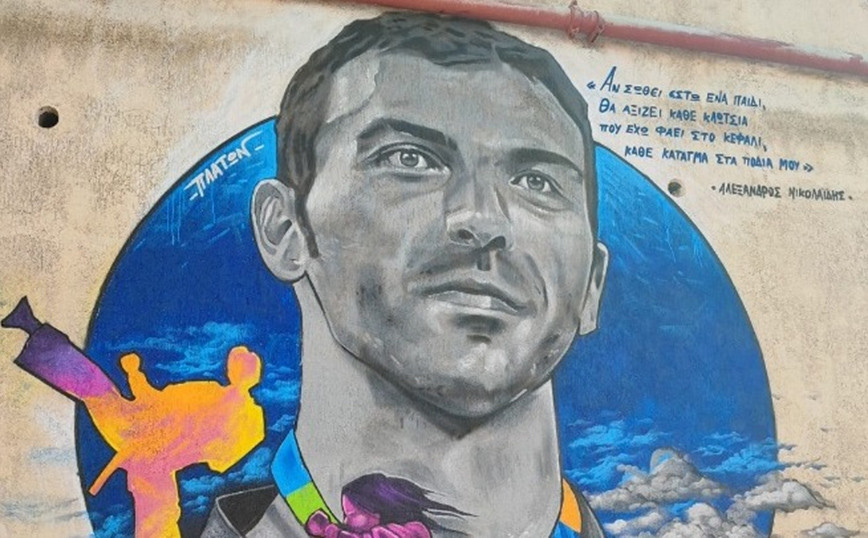 Συγκινεί το γκράφιτι που κοσμεί πλέον τον τοίχο του κολυμβητηρίου του Βύρωνα, με το πρόσωπο του δις «ασημένιου» Ολυμπιονίκη του Τάε Κβον Ντο, Αλέξανδρου Νικολαϊδη, ο οποίος εφυγε από τη ζωή μετά από «μάχη» με τον καρκίνο, στις 14 Οκτωβρίου, σε ηλικία 43 ετών. Ο Αλέξανδρος Νικολαϊδης, στο γκράφιτι που υπογράφει ο «Πλάτων», απεικονίζεται χαμογελαστός, γαλήνιος και έχει στον λαιμό του κρεμασμένο το ασημένιο μετάλλιο. Ο «Πλάτων» επέλεξε να προσθέσει και μία φράση από την τελευταία συγκλονιστική ανάρτηση που άφησε ο Αλέξανδρος Νικολαϊδης πριν φύγει από τη ζωή: «Αν σωθεί έστω κι ένα παιδί, θα αξίζει κάθε κλωτσιά που έχω φάει στο κεφάλι, κάθε κάταγμα στα πόδια μου».