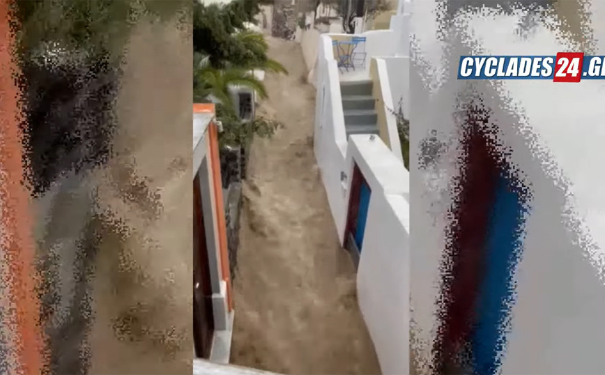 Απίστευτες σκηνές έζησαν οι κάτοικοι της Σαντορίνης, αφού κύμα σφοδρής κακοκαιρίας σαρώνει τα νησιά των Κυκλάδων. Δρόμοι του νησιού μετατράπηκαν σε ποτάμια, ενώ μια οικογένεια γλίτωσε τελευταία στιγμή από τα ορμητικά νερά. Σύμφωνα με το cyclades24.gr, στη περιοχή οι στενοί δρόμοι μετατράπηκαν σε ορμητικά ποτάμια, ενώ ένα λευκό στρώμα κάλυψε τις στέγες και τους δρόμους λόγω της σφοδρής χαλαζόπτωσης. Τα έντονα καιρικά φαινόμενα δημιούργησαν σοβαρά προβλήματα, ενώ στην περιοχή του Καρτεράδου, η δύναμη του νερού σάρωνε τα πάντα. Μάντρα οικοπέδου, δεν άντεξε την πίεση του νερού που είχε συσσωρευτεί στο οικόπεδο, με αποτέλεσμα να εκτοξευθεί στο δρόμο, ενώ ευτυχώς εκείνη την ώρα δεν περνούσε καν