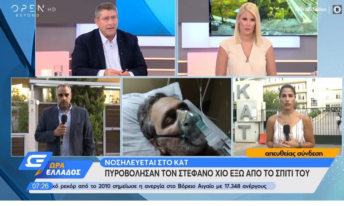 Εκτός κινδύνου φέρεται νοσηλεύεται ο Στέφανος Χίος. Άγνωστοι πυροβόλησαν και τραυμάτισαν τον δημοσιογράφο τα ξημερώματα, στα Βριλήσσια. «Ο Στέφανος Χίος δέχθηκε δύο σφαίρες από έναν άγνωστο που φορούσε μαύρα ρούχα και ο οποίος είχε συνεργό που τον περίμενε. Η μία πέρασε ξυστά από την καρωτίδα και η άλλη κοντά στην καρδιά, ενώ στο αυτοκίνητό του υπάρχουν δύο οπές από σφαίρες».