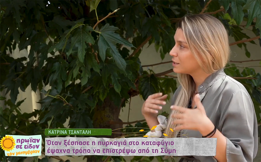 Στην εκπομπή «Πρωΐαν σε εἶδον τήν μεσημβρίαν» της ΕΡΤ παραχώρησε συνέντευξη η Κατρίνα Τσάνταλη η οποία συνάντησε τον παρουσιαστή Φώτη Σεργουλόπουλο στο καταφύγιο ζώων που έχει δημιουργήσει. Αρχικά, η Κατρίνα Τσάνταλη αναφέρθηκε στη μεγάλη πυρκαγιά που ξέσπασε τον περσινό Αύγουστο και απείλησε το καταφύγιο. Η φωνή της μάλιστα «έσπασε» τονίζοντας πως όταν έβλεπε τη φωτιά να πλησιάζει, ένιωσε πανικό, ενώ έκανε πολλές μέρες να ηρεμήσει από όλα όσα ένιωσε. «Ευτυχώς, είχα πάρα πολλούς φίλους εδώ, και πάρα πολλούς εθελοντές, οι οποίοι παρ’ ότι ήμουν στην Σύμη, ήρθαν, πήραν όλα τα ζώα. Έγινε εκκένωση δυο ώρες πριν μπει η φωτιά μέσα. Αλλά δεν αφήσαμε πίσω ούτε κουνούπι» είπε χαρακτηριστικά. «Ο Αντ