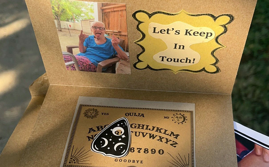 Η τελευταία κίνηση μιας γυναίκας έφερε γέλια στην κηδεία της. Μέσω Twitter, η Gracie Perryman, η οποία ζει στο Όστιν των ΗΠΑ, ανάρτησε μια ξεχωριστή κάρτα, η οποία περίμενε όσους παραβρέθηκαν στην κηδεία της γιαγιάς της. Σε αυτήν, η ηλικιωμένη γυναίκα τους… βγάζει τη γλώσσα. Το μετά θάνατον μήνυμα από τη γιαγιά ανέφερε: «Ας κρατήσουμε επαφή», μαζί με μια ακόμη πινελιά: ένα επιτραπέζιο παιχνίδι, έναν πίνακα πνευμάτων Ouija. «Έλαβα αυτό στην κηδεία της γιαγιάς μου», είπε η Perryman, λέγοντας πως είναι η εγγονή της γυναίκας. «Τι είδωλο». Η Perryman, η οποία ανάρτησε τη φωτογραφία στις 18 Οκτωβρίου, ανέφερε σε δηλώσεις της σε ΜΜΕ ότι η γιαγιά της Jodie Perryman πέθανε από καρκίνο στην ηλικία