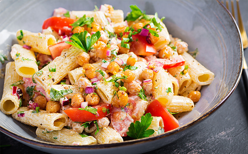 Υλικά 225 γρ. ζυμαρικά βρασμένα 1 φλ. τσαγιού μπουκετάκια μπρόκολου στον ατμό 1/2 φλ. τσαγιού καρότο, ψιλοκομμένο 1/2 φλ. τσαγιού κόκκινο κρεμμύδι, κομμένο σε φέτες 1/4 φλ. τσαγιού φρέσκος μαϊντανός 1/4 φλ. τσαγιού ελαιόλαδο 1/4 φλ. τσαγιού ξύδι από κόκκινο κρασί 1 σκελίδα σκόρδο, ψιλοκομμένη 1 κ. γλ. αποξηραμένη ρίγανη 1 1/2 φλ. τσαγιού ντοματίνια Αλάτι, πιπέρι Εκτέλεση Σε ένα μεγάλο μπολ ανακατέψτε τα ζυμαρικά με τα ρεβίθια, τα ντοματίνια, το μπρόκολο, τα καρότα, το κόκκινο κρεμμύδι και τον μαϊντανό. Σε ένα μικρό μπολ τοποθετήστε το ελαιόλαδο, το ξύδι από κόκκινο κρασί, το σκόρδο, τη ρίγανη, το αλάτι και το πιπέρι και ανακατέψτε να ενωθούν. Περιχύστε με το dressing τη σαλάτα ζυμαρικών κ