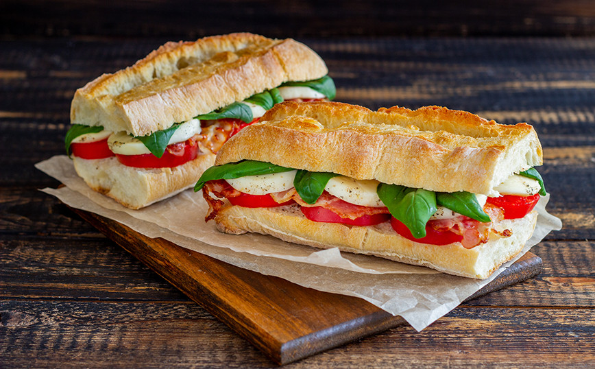 Υλικά 1 μπαγκέτα, κομμένη στη μέση κατά μήκος 1 σκελίδα σκόρδο, ξεφλουδισμένη και κομμένη στη μέση 2 μεγάλες ντομάτες, κομμένες σε φέτες 120 γρ. φρέσκια μοτσαρέλα, σε φέτες 15- 20 φύλλα φρέσκου βασιλικού Αλάτι και μαύρο πιπέρι κατά βούληση 1 κ. σ. ελαιόλαδο 1 κ. σ. βαλσάμικο ξύδι Εκτέλεση Προθερμάνετε το γκριλ και ψήστε τη μπαγκέτα με τις κομμένες πλευρές προς τα πάνω, σε απόσταση, για περίπου 2 λεπτά, μέχρι το εσωτερικό της να είναι ελαφρώς τραγανό. Τρίψτε κάθε μισό με μισή σκελίδα σκόρδο -το τραγανό ψωμί θα απελευθερώσει τα αιθέρια έλαια του σκόρδου, δίνοντάς σας στιγμιαίο σκορδόψωμο. Στρώστε το κάτω μισό της μπαγκέτας, εναλλάσσοντας με φέτες ντομάτας, μοτσαρέλα και φύλλα βασιλικού. Αλα