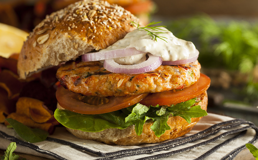 Υλικά 1 μεγάλο αυγό, ελαφρά χτυπημένο 1 κονσέρβα σολομού, στραγγισμένη εντελώς 1/2 φλ. τσαγιού ψίχουλα ψωμιού panko 1 σκελίδα σκόρδο, ψιλοκομμένη Ξύσμα από 1 λεμόνι 2 κ. σ. χυμό λεμονιού 2 κ. σ. φρεσκοκομμένο άνηθο 1 κ. σ. μουστάρδα 1 κ. γλ. σάλτσα Worcestershire 1/2 κ. γλ. νιφάδες κόκκινου πιπεριού Αλάτι Φρεσκοτριμμένο μαύρο πιπέρι 1 κ. σ. ελαιόλαδο Ψωμάκια μπέργκερ, για το σερβίρισμα Μαγιονέζα, για το σερβίρισμα Φύλλα μαρούλι, για το σερβίρισμα Ντομάτα, για το σερβίρισμα Κόκκινο κρεμμύδι, για το σερβίρισμα Εκτέλεση Σε ένα μεγάλο μπολ, συνδυάστε το σολομό με το αυγό, τα ψίχουλα ψωμιού, το σκόρδο, το ξύσμα και το χυμό λεμονιού, τον άνηθο, τη μουστάρδα, τη σάλτσα Worcestershire και τις νιφ