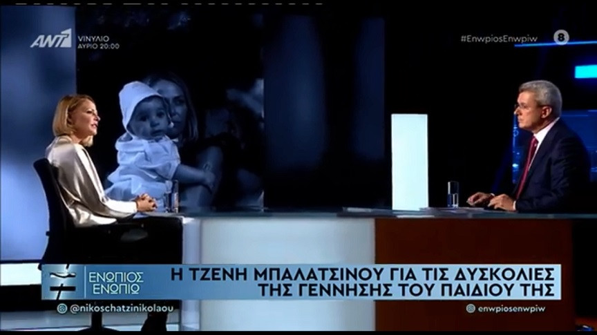 Στην εκπομπή «Ενώπιος Ενωπίω» και καλεσμένη του Νίκου Χατζηνικολάου ήταν την Πέμπτη (18/11) η Τζένη Μπαλατσινού, η οποία αναφέρθηκε στην επιτυχημένη, πολυεπίπεδη καριέρα της, αλλά και στην προσωπική της ζωή, με την πιο φορτισμένη στιγμή της συνέντευξης να είναι όταν η ίδια μίλησε για τις δυσκολίες της τελευταίας της εγκυμοσύνης που έβαλαν σε κίνδυνο τη ζωή της. Στην ερώτηση αν συστήνεται ως παρουσιάστρια, επιχειρηματίας ή μοντέλο απάντησε «Μάνα. Έχω μία μητρική στόφα σε όλες μου τις εκφάνσεις. Θέλω να προστατεύω και να με νιώθουν κοντά τους». Μιλώντας για τα παιδιά της είπε: «Κάθε φορά η αγάπη διπλασιάζεται, τώρα με το μωρό μας νόμιζα ότι θα είμαι πιο χαλαρή… Η αγάπη της μάνας και του πατ
