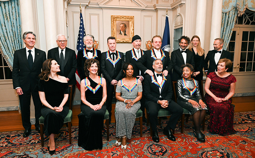 Ο Τζορτζ Κλούνεϊ, η τραγουδίστρια της κάντρι Έιμι Γκραντ, η τραγουδίστρια Γκλάντις Νάιτ, η συνθέτης Τάνια Λεόν και οι U2 τιμήθηκαν χθες, Κυριακή, με τις διακρίσεις του Kennedy Center για τη συμβολή τους στον χώρο των τεχνών έπειτα από μια δεξίωση που δόθηκε προς τιμήν τους στον Λευκό Οίκο. Η εκδήλωση του Κέντρου Κένεντι, που φέτος συμπληρώνει 45 χρόνια, πραγματοποιείται προς τιμήν καλλιτεχνών από τον χώρο της μουσικής, του θεάτρου και του κινηματογράφου που τιμώνται για την συνεισφορά τους στον αμερικανικό πολιτισμό. Στην εκδήλωση που παρέθεσε στον Λευκό Οίκο προς τιμήν των πέντε καλλιτεχνών ο πρόεδρος των ΗΠΑ Τζο Μπάιντεν απευθύνθηκε στον καθέναν από αυτούς προσωπικά εξαίροντας το ταλέντ