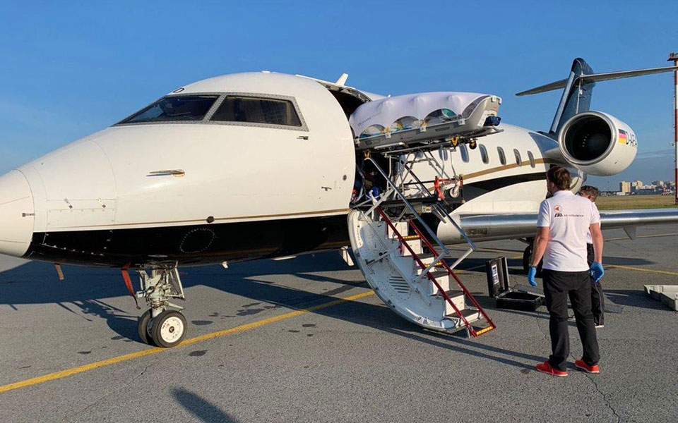 Το αεροσκάφος-ασθενοφόρο μεταφέρει τον Ναβάλνι, που βρίσκεται σε κώμα αφότου, σύμφωνα με το περιβάλλον του, υπέστη «δηλητηρίαση», τη σύζυγό του Γιούλια Ναβάλναγια, καθώς και μια ομάδα Γερμανών γιατρών, έπειτα από ένα 24ωρο μπρα-ντε-φέρ για τη διακομιδή του στη γερμανική επικράτεια.