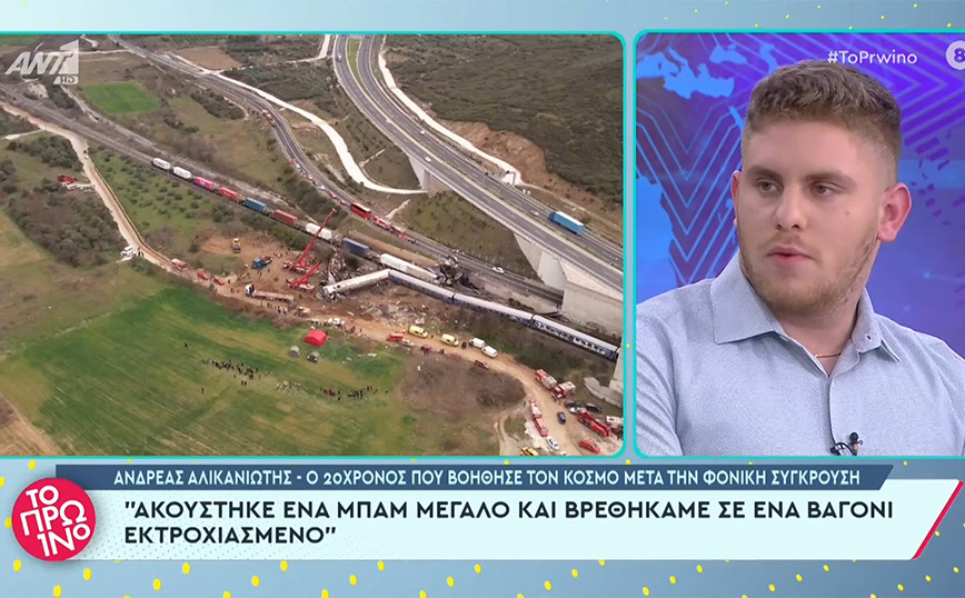 Ο 20χρονος Ανδρέας Αλικανιώτης που μαζί με άλλους νεαρούς διέσωσαν πολλά άτομα στη τραγωδία στα Τέμπη, μίλησε για τις πρώτες στιγμές μετά τη σύγκρουση των δύο τρένων, όπου η περιοχή θύμιζε βομβαρδισμένο τοπίο. Ο νεαρός μίλησε στον ΑΝΤ1 και δήλωσε πως «εκείνη την ώρα που μιλούσα στο τηλέφωνο, εννοείται ότι μου ήρθε από το πουθενά, ακούστηκε ένα εκκωφαντικό μπαμ, μία έκρηξη, και βρεθήκαμε σε ένα βαγόνι εκτροχιασμένο, αυτό που φαίνεται στις εικόνες να κάνει το “γάμα”. Εσβησαν αμέσως τα φώτα στο τρένο, καθώς αποσυνδέθηκε από το ηλεκτρικό ρεύμα. Δεν έσπασαν όλα τα τζάμια». «Το δικό μου τζάμι το έσπασα με βαλίτσα, καθώς δεν μπορούσαμε να βρούμε το σφυράκι. Στην κάθε καμπίνα ήμασταν