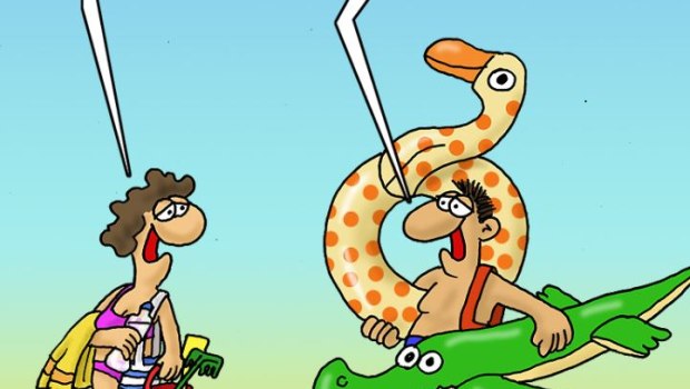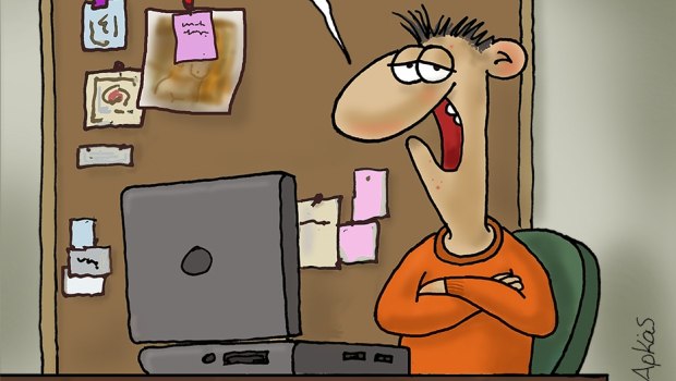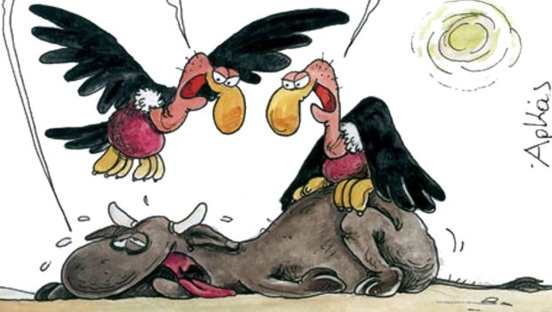 Στο χαρακτηριστικό του ύφος, ο Αρκάς αποτυπώνει τη σκληρή ειρωνεία της αδιαφορίας μέσα στον αποπνικτικό καύσωνα. Ένα εξαντλημένο ζώο εκλιπαρεί για νερό, αλλά τα όρνια που παραμονεύουν πάνω του το ειρωνεύονται: «Νερό, ιδρωμένος; Τρελάθηκες; Θες να κλείσει ο λαιμός σου;» Το σκίτσο, αν και φαινομενικά χιουμοριστικό, θίγει την απανθρωπιά της εποχής μας. Μια κοινωνία που, […]