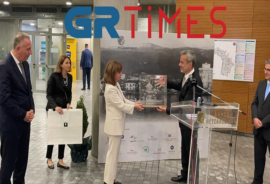 Την Πρόεδρο της Δημοκρατίας Κατερίνα Σακελλαροπούλου υποδέχθηκε απόψε (26/10), στο Δημαρχείο, ο Δήμαρχος Θεσσαλονίκης Κωνσταντίνος Ζέρβας, στο πλαίσιο εκδήλωσης προς τιμήν της, με την ευκαιρία της εορτής του Πολιούχου Αγίου Δημητρίου και της απελευθέρωσης της πόλης. «Η παρουσία της Προέδρου της Δημοκρατίας αποτελεί μεγάλη τιμή. Εμείς τη θεωρούμε Θεσσαλονικιά. Γνωρίζουμε πολύ καλά πόσο συχνά έρχεται, πόσο αγαπά τη Θεσσαλονίκη και η Θεσσαλονίκη της ανταποδίδει την αγάπη αυτή. Η Θεσσαλονίκη γιορτάζει τα 110 χρόνια από την απελευθέρωσή της. Πρόκειται για χρόνια δημιουργίας, χρόνια δύσκολα, αλλά σε κάθε περίπτωση χαιρόμαστε που η πόλη βλέπει το μέλλον με αισιοδοξία. Είναι μέρες λαμπερές και θέ