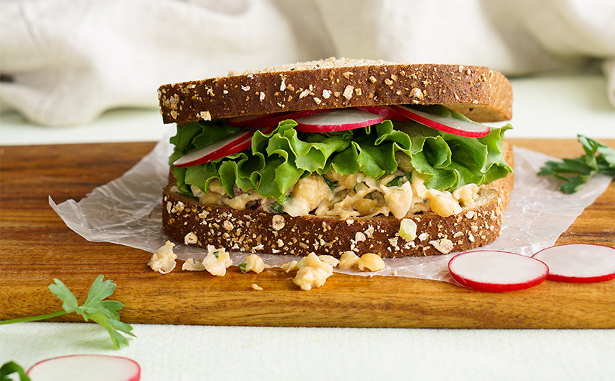 Υλικά 425 γρ. βρασμένα ρεβύθια 1/4 φλ. τσαγιού κόκκινο κρεμμύδι κομμένο σε κύβους 1/2 κόκκινη πιπεριά, κομμένη σε κύβους 3 κ. σ. vegan μαγιονέζα 1/2 κ. γλ. μουστάρδα 1/2 κ. γλ. σκόνη σκόρδου 1/2 κ. γλ. κρεμμύδι σε σκόνη Αλάτι, πιπέρι 1 κ. σ. φρέσκο άνηθο, ψιλοκομμένο Μαρούλι, για σερβίρισμα Ψωμί, κομμένο σε φέτες, για σερβίρισμα Εκτέλεση Τοποθετήστε τα ρεβύθια σε ένα μέτριο μπολ και πολτοποιήστε μέχρι να αποκτήσετε μια χοντρή υφή. Προσθέστε το κόκκινο κρεμμύδι, την κόκκινη πιπεριά, τη vegan μαγιονέζα, τη μουστάρδα, το σκόρδο σε σκόνη, το κρεμμύδι σε σκόνη, το αλάτι, το πιπέρι και τον άνηθο και ανακατέψτε μέχρι να ομογενοποιηθούν. Αποθηκεύστε τη ρεβυθοσαλάτα στο ψυγείο για έως και πέντε ημ