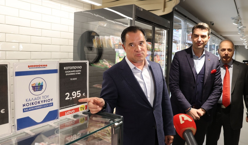 Δηλώσεις για την εξέλιξη των τιμών στα σούπερ μάρκετ, το καλάθι του νοικοκυριού και την πρωτοβουλία της Ισπανικής κυβέρνησης για μηδενισμό του ΦΠΑ σε ορισμένα είδη πρώτης ανάγκης έκανε σήμερα ο Υπουργός Ανάπτυξης και Επενδύσεων Άδωνις Γεωργιάδης, στο πλαίσιο της επίσκεψής του σε καταστήματα των αλυσίδων σούπερ μάρκετ. Συγκεκριμένα ο κ. Γεωργιάδης δήλωσε: «Έχω έρθει σήμερα σε ένα κατάστημα της αλυσίδας «Μασούτης», σε λίγο θα πάω και σε ένα κατάστημα της αλυσίδας «Σκλαβενίτης», διότι οι τιμές στο «Καλάθι του Νοικοκυριού» για 9η συνεχόμενη εβδομάδα -πλέον δεν είναι μία και δύο βδομάδες, είναι εννέα εβδομάδες, πάμε στους 2,5 μήνες- έχουν μείνει όχι απλά σταθερές, όχι απλά με λιγότερο πληθωρισ