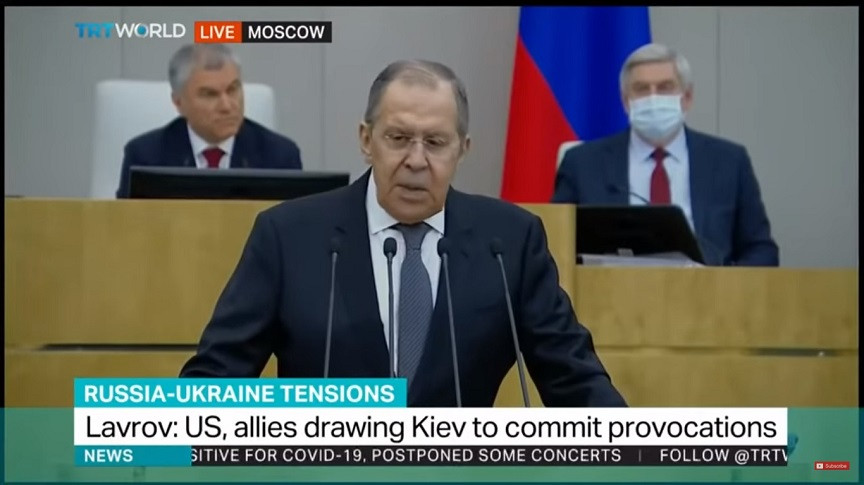 Η Δύση «επιθυμεί πολύ κάποια πραγματική προβοκάτσια» στην Ουκρανία, υποστήριξε ο Ρώσος υπουργός Εξωτερικών Σεργκέι Λαβρόφ, δηλώνοντας στη ρωσική Κρατική Δούμα (κάτω Βουλή) ότι «οι δυτικοί μας συνάδελφοι βρίσκονται, χωρίς υπερβολή, σε ένα είδος πολεμικής μέθης. Μόνο γι’ αυτό μιλούν: θα τιμωρήσουμε εάν επιτεθείτε, θα τιμωρήσουμε, θα σώσουμε την Ουκρανία κ.ο.κ.». Μιλώντας σε ειδική ακρόαση για τη ρωσική εξωτερική πολιτική στην ολομέλεια της ρωσικής κάτω Βουλής, ο Σ. Λαβρόφ είπε ότι η απομάκρυνση δυτικών διπλωματών από το Κίεβο το «μόνο» που κάνει είναι να «ενισχύει την υστερία», τη στιγμή που οι ίδιοι οι Ουκρανοί πολιτικοί ήδη καλούν σε ηρεμία, «αλλά η Δύση δεν θέλει να ηρεμήσουν ούτε αυτοί,