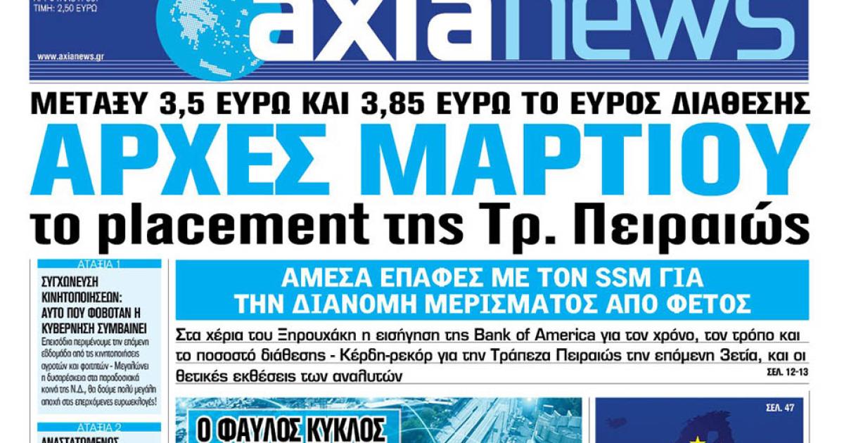Στην «Axianews»: «Αρχές Μαρτίου το placement της Τρ. Πειραιώς»
