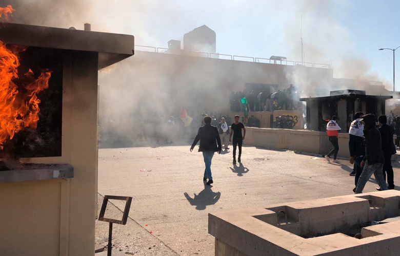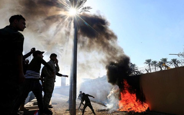 Διαδηλωτές και παραστρατιωτικοί μαχητές, εξοργισμένοι από τα αμερικανικά αεροπορικά πλήγματα στο Ιράκ, πυρπόλησαν ένα φυλάκιο έξω από την πρεσβεία των ΗΠΑ στη Βαγδάτη και επιδόθηκαν σε πετροπόλεμο, την ώρα που οι ιρανικές δυνάμεις ασφαλείας και οι φρουροί της αμερικανικής διπλωματικής αποστολής απαντούσαν με δακρυγόνα και βομβίδες κρότου-λάμψης.