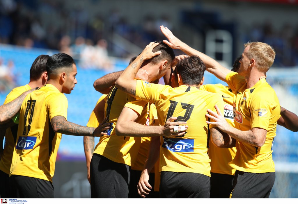 Η σύνθεση της ΑΕΚ: Αθανασιάδης, Ρότα, Μήτογλου, Τζαβέλλας, Σιμάνσκι, Γιόνσον, Γκατσίνοβιτς, Μάνταλος, Γκαρσί