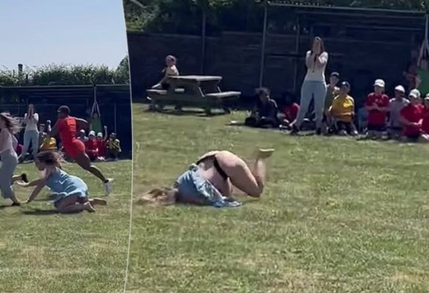 Μια σχολική εκδήλωση δεν πήγε ιδιαίτερα καλά για μια μητέρα. Η στιγμή που η 36χρονη Katie Hannaford από την Αγγλία πέφτει κάτω, το φόρεμά της σηκώνεται και το στρινγκ της αποκαλύπτεται μπροστά σε μαθητές και τους γονείς καταγράφηκε και άρχισε να κυκλοφορεί στο ίντερνετ. Η Hannaford δήλωσε στο SWNS ότι η 8χρονη κόρη της της είχε ζητήσει να συμμετάσχει στην εκδήλωση με τη συμμετοχή των γονέων στις 15 Ιουνίου. Η επιχειρηματίας ομολογεί ότι δεν είναι αθλητικός τύπος, σημειώνοντας: «Ήξερα ότι θα βγω τελευταία στον αγώνα». Στο βίντεο που κυκλοφόρησε, η μητέρα φαίνεται να ξεκινά τον αγώνα, γρήγορα όμως να μένει πίσω και τελικά να σωριάζεται στο έδαφος με τα γόνατα. Το φόρεμά της σηκώνεται αποκαλ