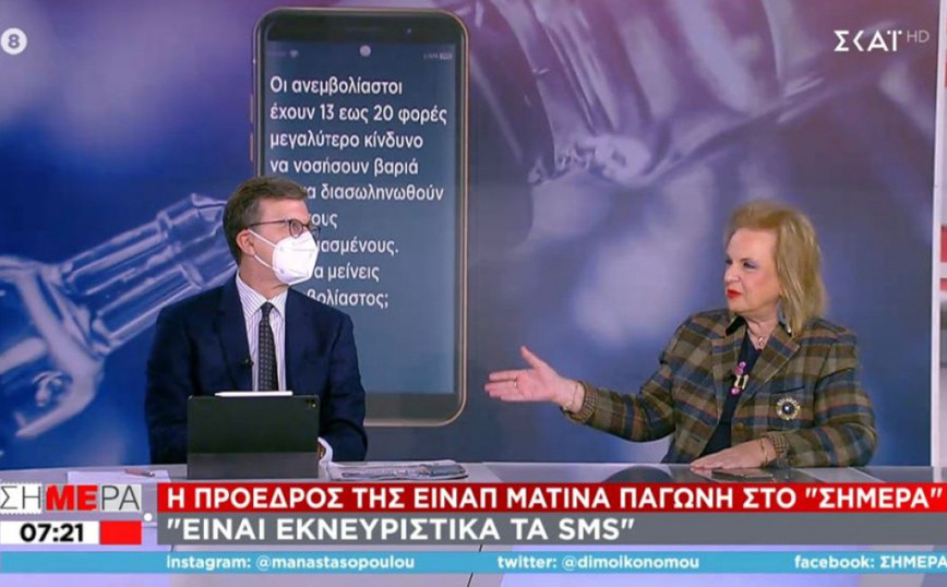 Προβληματισμός στους ειδικούς για την εκστρατεία ενημέρωσης για τον εμβολιασμό με SMS σε ανεμβολίαστους. Κατηγορηματικό «όχι» από Μόσιαλο και Παγώνη.Αμφιβολίες για την αποτελεσματικότητα που θα έχει τελικά το μέτρο της καθημερινής αποστολής SMS σε ανεμβολίαστους, για την ενημέρωσή τους για τον εμβολιασμό. Η πρόεδρος της ΕΙΝΑΠ, Ματίνα Παγώνη, εξέφρασε τον προβληματισμό της σε σημερινές της δηλώσεις, λέγοντας χαρακτηριστικά πως «είναι εκνευριστικά» και πως «δεν ξέρω κατά πόσο θα πετύχει». Μιλώντας στον ΣΚΑΪ, η κ. Παγώνη εξήγησε ότι η Πολιτεία απευθύνεται σε μια συγκεκριμένη ομάδα που χρήζει ιδιαίτερης μεταχείρισης, που μέχρι τώρα δεν έχει πειστεί να εμβολιαστεί. «Ξεκινήσαμε με πολύ χαμηλά ποσοστά