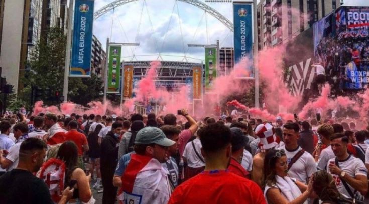 Τον γύρο του διαδικτύου κάνει μια φωτογραφία που δείχνει έναν Άγγλο οπαδό με το καπνογόνο του, πριν την έναρξη του τελικού του Euro 2020. Αγγλία και Ιταλία κοντράρονται στο Λονδίνο και οι οπαδοί των γηπεδούχων έχουν… οργιάσει όλη την ημέρα. Συγκεντρώθηκαν από νωρίς στο Γουέμπλεϊ, στη συνέχεια, σε άλλο σημείο της πόλης, παδοπατούσαν ιταλική σημαία αφού πρώτα προσπάθησαν να την κάψουν, ενώ ακολούθησε και ντου στο Γουέμπλεϊ από οπαδούς που δεν είχαν εισιτήρια. Μέσα σε όλα αυτά, όμως, είχαμε κι άλλα… Τα οποία δεν μπορούν να χαρακτηριστούν, παρά μόνο να παρουσιαστούν μέσω της παρακάτω φωτογραφίας, η οποία έχει γίνει viral στα social media.