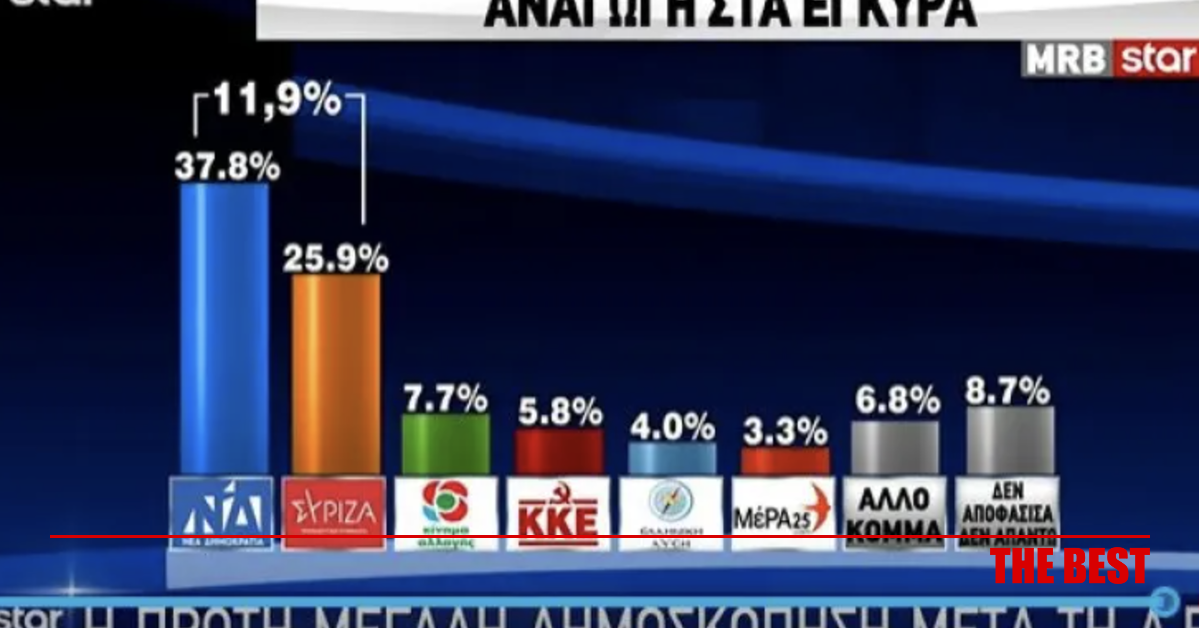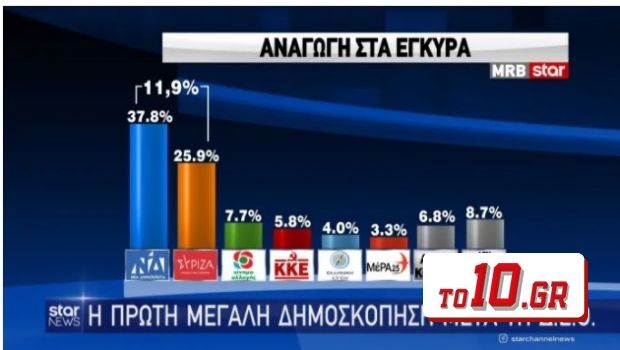 Στη δημοσκόπηση της MRB για το STAR η διαφορά της Νέας Δημοκρατίας με τον ΣΥΡΙΖΑ μετά τη ΔΕΘ να βρίσκεται στο 11,9%, με τους πολίτες να απαντούν σε μία σειρά από ερωτήματα. Συγκεκριμένα στην πρόθεση ψήφου με αναγωγή η ΝΔ συγκεντρώνει το 37,8%, ο ΣΥΡΙΖΑ το 25,9%, το ΚΙΝΑΛ το 7,7%, το ΚΚΕ το 5,8%, η Ελληνική Λύση το 4%, το ΜέΡΑ 25 το 3,3%, άλλο κόμμα 6,8%, αναποφάσιστοι 8,7%. Για τα μέτρα που εξήγγειλε στη ΔΕΘ ο Κυριάκος Μητσοτάκης πολύ ή αρκετά αποτελεσματικά τα βρήκαν το 30,4%, λίγο ή καθόλου αποτελεσματικά το 58,4%, ενώ το 11,2% απάντησε δεν ξέρω-δεν απαντώ. Για την αξιολόγηση των προσώπων που ανέλαβαν υπουργεία: Παναγιώτης Θεοδωρικάκος (Προστασίας του Πολίτη): 32,4% σίγουρα/μάλλον θετικ