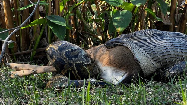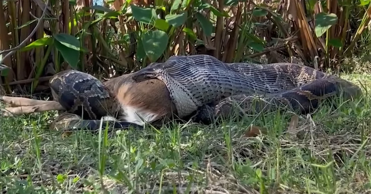 Ένας τεράστιος πύθωνας της Βιρμανίας βρέθηκε να καταπίνει ολόκληρο ένα ελάφι στα Έβεργκλεϊντς της Φλόριντα. Το εντυπωσιακό εύρημα αλλάζει όσα υπέθεταν οι βιολόγοι για το τι είναι σωματικά ικανά να καταφέρουν τα συγκεκριμένα φίδια. «Ήταν σαν να πιάναμε έναν κατά συρροή δολοφόνο επ’ αυτοφώρω και ήταν πολύ έντονο να το παρατηρούμε σε πραγματικό χρόνο», δήλωσε στο Live Science ο Ian Bartoszek, βιολόγος άγριας ζωής και επιστημονικός συντονιστής της οργάνωσης Conservancy of Southwest Florida. Ο θηλυκός πύθωνας της Βιρμανίας (Python bivittatus) είχε μήκος 4,5 μέτρα και ζύγιζε 52 κιλά. Έτρωγε ένα ελάφι με λευκή ουρά (Odocoileus virginianus) που ζύγιζε 35 κιλά – σχεδόν το 67% της μάζας του φ