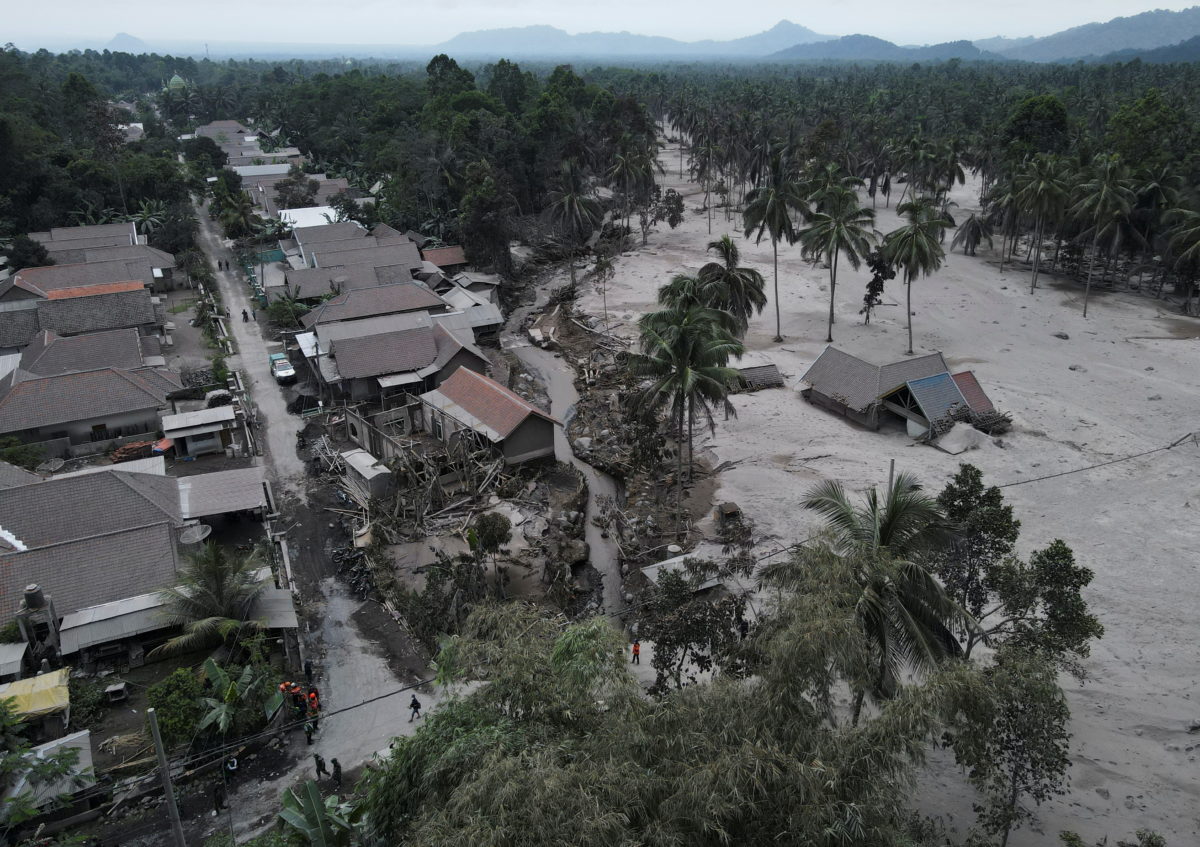 Σε εικόνες που τραβήχτηκαν από εναέρια μέσα φαίνονται στέγες να προεξέχουν από τη στάχτη, ενώ στο έδαφος, στρατιωτικοί, αστυνομικοί και πολίτες σκάβουν με τα χέρια τους για να ανασύρουν πτώματα.