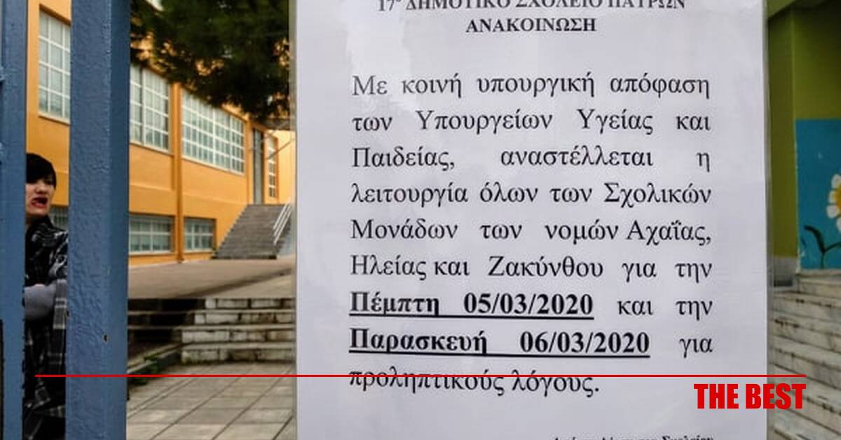 Από την Γραμματεία του Λαϊκού Φροντιστηρίου Αλληλεγγύης του Δήμου Πατρέων, ανακοινώνεται ότι αναστέλλεται η λειτουργία του για σήμερα Πέμπτη 5 και αύριο Παρασκευή 6 Μαρτίου, ως μέτρο προστασίας από την εξάπλωση του κορωνοϊού. Θυμίζουμε, ότι από τον Δήμο Πατρέων, ανακοινώθηκε ήδη από χθες το βράδυ, ότι σήμερα Πέμπτη 5 και αύριο Παρασκευή 6 Μαρτίου, θα παραμείνουν κλειστά, το Δημοτικό Βρεφοκομείο, οι Παιδικοί Σταθμοί, τα ΚΔΑΠ και τα ΚΔΑΠ ΜΕΑ, τα ΚΑΠΗ του Δήμου, καθώς και το Χορευτικό Τμήμα του Πολιτιστικού Οργανισμού του Δήμου. Η απόφαση ελήφθη μετά την σχετική ανακοίνωση από τον εκπρόσωπο του Υπουργείου Υγείας καθηγητή Σωτήρη Τσιόδρα και […]