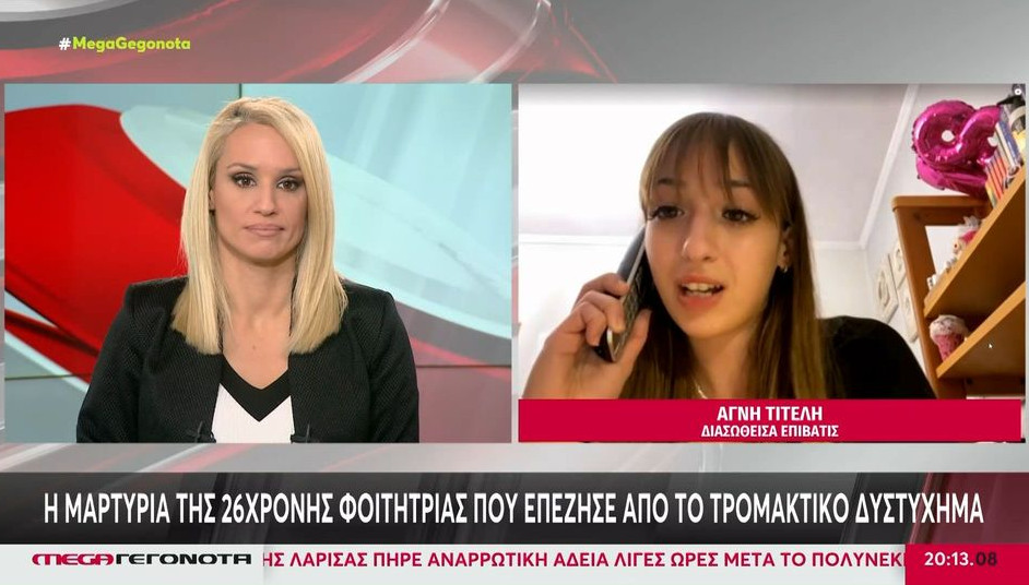 Συγκλονίζει η μαρτυρία φοιτήτρια που επέβαινε στο 7ο βαγόνι του μοιραίου Intercity των Τεμπών, περιγράφοντας όλα όσα έζησε κατά τη διάρκεια της σφοδρής σύγκρουσης που προκάλεσε τον θάνατο 57 ανθρώπων. Η Αγνή Τιτέλη περιέγραψε στο κεντρικό δελτίο του Mega και τη δημοσιογράφο, Κατερίνα Παναγοπούλου, τα πρώτα δραματικά λεπτά της σύγκρουσης: «Για καλή μου τύχη ήμουν στο βαγόνι 7. Δεν νομίζω ότι το έζησα με τόση ένταση όσο τα παιδιά που ήταν στα μπροστινά βαγόνια». Στη συνέχεια η 26χρονη φοιτήτρια είπε: «Τη στιγμή της σύγκρουσης ταρακουνηθήκαμε πάρα πολύ. Το νιώσαμε αρκετά κι εκείνη τη στιγμή εγώ, σαν Αγνή, ένιωσα ότι μπορεί και να πεθάνω. Δεν βλέπαμε έξω, οπότε υπέθεσα ότι το τρένο ίσως εκτρο
