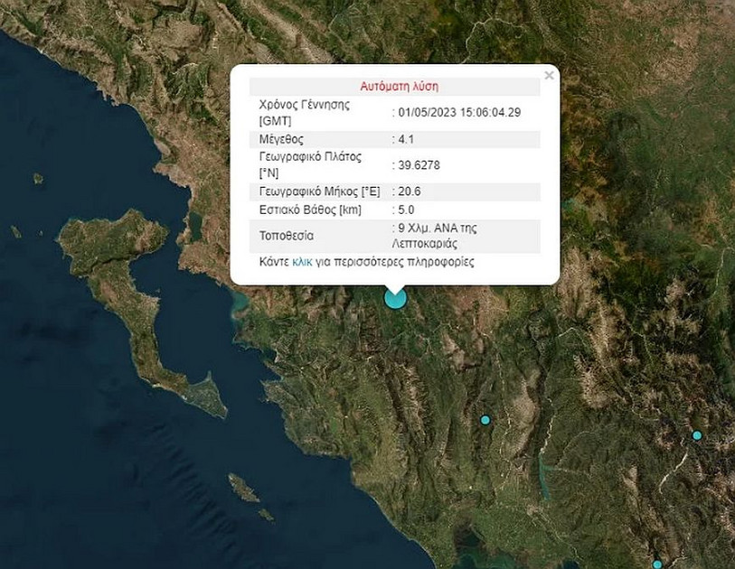 Σεισμός 4,1 Ρίχτερ ταρακούνησε τον νομό Ιωαννίνων, το απόγευμα της Δευτέρας. Η σεισμική δόνηση σημειώθηκε 9 χλμ ανατολικό-νοτιοανατολικά της Λεπτοκαριάς, έχοντας εστιακό βάθος τα 5χλμ. Το επίκεντρο της δόνησης, που σημειώθηκε στις 18:06, εντοπίζεται 13 χιλιόμετρα ανατολικά – νοτιοανατολικά της Λεπτοκαρυάς Ιωαννίνων, σύμφωνα με την αναθεωρημένη λύση του Γεωδυναμικού Ινστιτούτου. Ο σεισμός έγινε αισθητός τόσο στα Γιάννενα, όσο και σε πολλές περιοχές σε μεγάλη απόσταση. Το μεσημέρι της Πρωτομαγιάς σημειώθηκε σεισμός 3,2 Ρίχτερ στη Σιθωνία Χαλκιδικής. Το εστιακό βάθος ήταν 14,5 χιλιόμετρα. Το Newsbeast παρακολουθεί όλες τις εξελίξεις και θα σας ενημερώσει για όλα τα νεότερα. Σεισμός