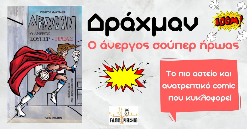 Οι εκδόσεις Φυλάτος παρουσιάζουν το βιβλίο του Γιώργου Μαυρίδη: «Δράχμαν - Ο άνεργος σούπερ - ήρωας». Πώς είναι να είσαι υπερήρωας αλλά να είσαι… άνεργος και να ψάχνεις δουλειά; Ο Δράχμαν το γνωρίζει πολύ καλά αυτό από πρώτο χέρι! Ζει με τη μητέρα του και τη γάτα του και τα τελευταία χρόνια επιδίδεται σε έναν αγώνα δρόμου για να βρει δουλειά.Παρά το γεγονός ότι είναι σούπερ ήρωας και έζησε χρόνια μεγάλης δόξας, τώρα δυσκολεύεται να πληρώσει το ρεύμα του, να βρει χρήματα για το εισιτήριο στα μέσα μεταφοράς ή να αγοράσει… σουβλάκια για τη γάτα του. Η υπερδύναμή του; Να εμφανίζει ως δια μαγείας δραχμές! Το πρόβλημα; Του είναι πλέον παντελώς άχρηστες.Οι περιπέτειες ενός άνεργου σούπερ ήρωα είναι γεμ