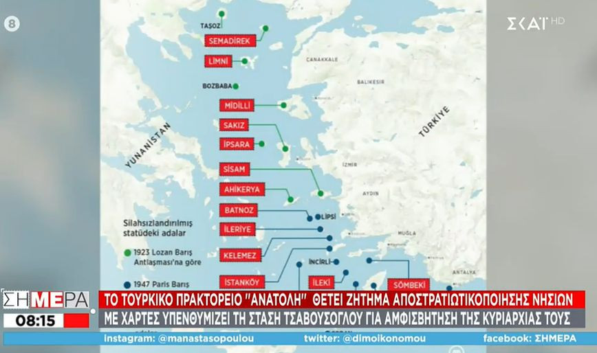 Σε επιθετική στάση παραμένει η Τουρκία, με τα φιλοκυβερνητικά ΜΜΕ να ακολουθούν την προκλητική στάση της Άγκυρας, θέτοντας θέμα διεκδίκησης 22 ελληνικών νησιών, επικαλούμενα τη «Συνθήκη της Λωζάνης», μέσω της οποία θεωρούν ότι μπορούν να αμφισβητήσουν την κυριαρχία τους. Η Milliyet γράφει στο πρωτοσέλιδό της ότι «κάποια από τα νησιά που μπορεί να διεκδικήσει η Τουρκία λόγω της στρατιωτικοποίησης είναι η Ρόδος, η Χίος και η Λέσβος», ενώ η Yeni Safak αναφέρει ότι αυτά τα 22 νησιά είναι στρατιωτικοποιημένα (σ.σ. μοναδική εξαίρεση η Χάλκη), τονίζοντας ότι «η σταρατιωτικοποίηση είναι απειλή». Μάλιστα, τα δημοσιεύματα από τη γειτονική χώρα αναφέρουν ότι η Τουρκία έχει την κυριαρχία εννέα νησιών