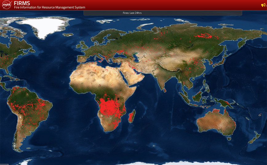 Μια εικόνα, χίλιες λέξεις έλεγαν οι Κινέζοι… Μόνο που μια εικόνα από τη NASA κόβει την ανάσα, καθώς όλα μαρτυρούν πως η κλιματική αλλαγή είναι εδώ και τα μηνύματα είναι άκρως απογοητευτικά. Στην ψηφιακή πλατφόρμα της FIRMS (Fire Information for Resource Management System), μπορεί να δει κανείς, σε πραγματικό χρόνο όλα τα ενεργά μέτωπα στον πλανήτη. Τα κόκκινα σημάδια στον παγκόσμιο χάρτη παραπέμπουν στις χιλιάδες εστίες φωτιάς που έχουν ξεσπάσει σε όλο τον κόσμο. Αυτή τη στιγμή, η Αφρική κατέχει τη θλιβερή πρωτιά, με μεγάλα τμήματα στο νότιο κομμάτι της, καθώς και της παρακείμενης Μαδαγασκάρης, να έχουν παραδοθεί στις φλόγες. Επίσης, φωτιές μαίνονται και σε Βόρεια και Νότια Αμερική