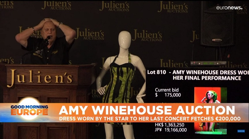 Σε δημοπρασία που διοργάνωσε ο οίκος Julien’s Auctions και η οικογένεια της Έιμι Γουάινχαουζ στο Μπέβερλι Χιλς του Λος Άντζελες στις Η.Π.Α., πωλήθηκε για 243 χιλιάδες δολάρια το φόρεμα που φόρεσε η αείμνηστη τραγουδίστρια στην τελευταία της συναυλία. Το μίνι εξώπλατο φόρεμα που έβαλε στο Βελιγράδι τον Ιούνιο του 2011, ένα μήνα προτού πεθάνει σε ηλικία 27 ετών από υπερβολική δόση ναρκωτικών και αλκοόλ, ήταν το κεντρικό κομμάτι της δημοπρασίας. Παράλληλα, διατέθηκαν κι άλλα προσωπικά και επαγγελματικά της αντικείμενα. Στόχος της οικογένειάς της ήταν να υπάρχει ποικιλία τιμών προκειμένου οι fans της να μπορέσουν ν’ αποκτήσουν κάτι δικό της. Το φόρεμα πωλήθηκε σε τιμή 16 φορές πάν