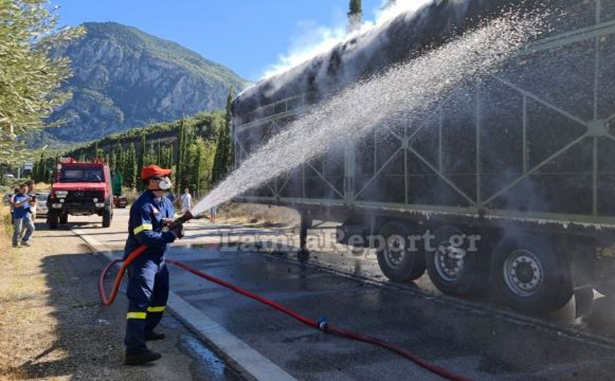 Λαμία: Νταλίκα με βαμβάκι πήρε φωτιά – Οι φλόγες επεκτάθηκαν την Εθνική Οδό