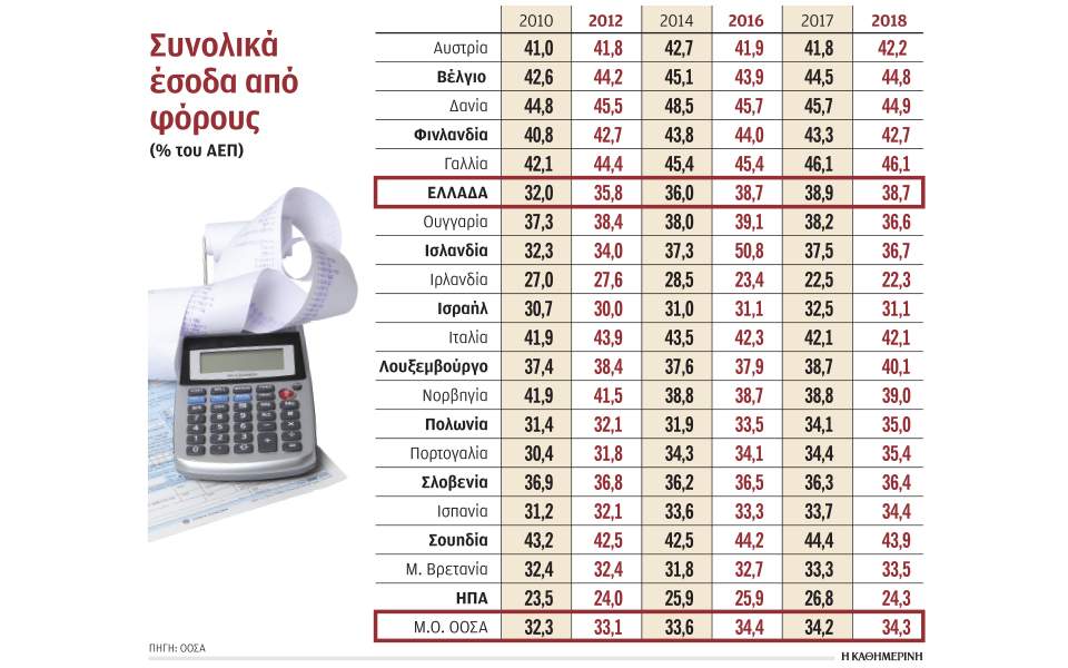 Από τις χώρες με τη μικρότερη φορολογική επιβάρυνση το 1965, εκτινάχθηκε στις χώρες με την υψηλότερη φορολογική επιβάρυνση στα χρόνια της κρίσης και συνεχίζει ακόμα. Οπως προκύπτει από την έκθεση Revenue Statistics 1965-2018 του ΟΟΣΑ, το 1965 η Ελλάδα είχε φορολογικά έσοδα που αντιστοιχούσαν στο 17,1% του ΑΕΠ, όταν ο μέσος όρος στον ΟΟΣΑ ήταν 24,9%, τριάντα χρόνια αργότερα, το 1995, ήταν και πάλι κάτω από τον μέσο όρο των 34 χωρών του ΟΟΣΑ (25,2% έναντι 31,9%).