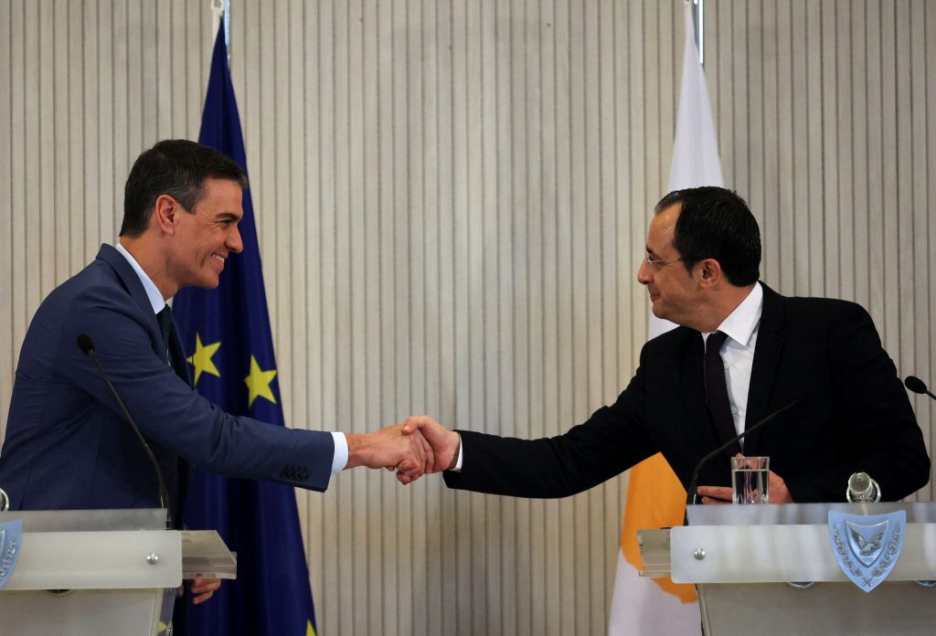 Επανέναρξη του διαλόγου για το Κυπριακό θέλει η Ισπανία. Τι είπαν Σάντσεθ - Χριστοδουλίδης. Η Ισπανία θα αναλάβει πρωτοβουλία για να επαναρχίσει ο διάλογος για το Κυπριακό, επισήμανε σήμερα ο Πρωθυπουργός της Ισπανίας Πέδρο Σάντσεθ, ο οποίος είχε σήμερα συνάντηση με τον Πρόεδρο της Κυπριακής Δημοκρατίας Νίκο Χριστοδουλίδη, στο Προεδρικό Μέγαρο στη Λευκωσία. Ο Ισπανός Πρωθυπουργός τόνισε, επίσης, ότι η χώρα του στηρίζει σθεναρά την αναζήτηση μιας λύσης διζωνικής δικοινοτικής ομοσπονδίας στο Κυπριακό, μιας λύσης που να είναι μόνιμη, δίκαιη, που θα βασίζεται στα ψηφίσματα του ΟΗΕ και τις αρχές του διεθνούς δικαίου. Χριστοδουλίδης και Σάντσεθ προέβησαν σε δηλώσεις στα ΜΜΕ, στο Προεδρικό Μέγαρο, ύστε