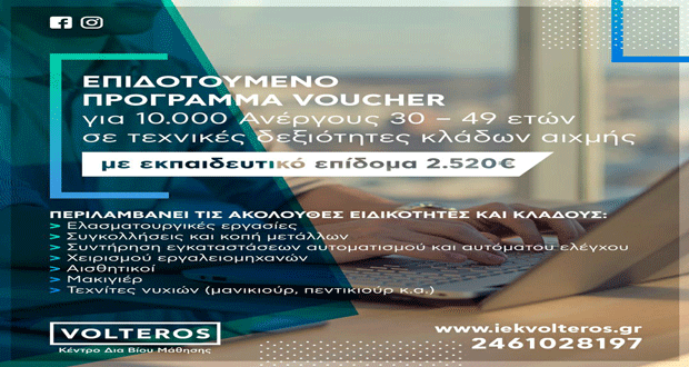 The post ΚΕ.ΔΙ.ΒΙ.Μ. 2 VOLTEROS: Νέο επιδοτούμενο πρόγραμμα Voucher για 10.000 άνεργους 30-49 ετών σε τομείς τεχνικών επαγγελμάτων appeared first on e-ptolemeos.gr.