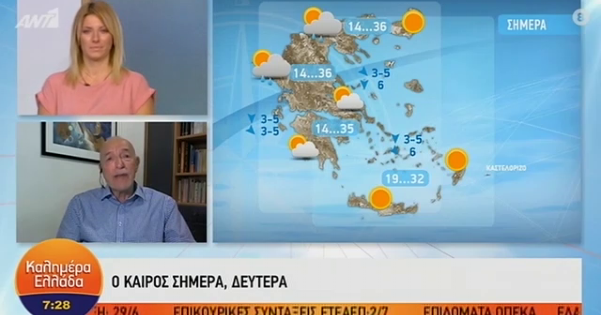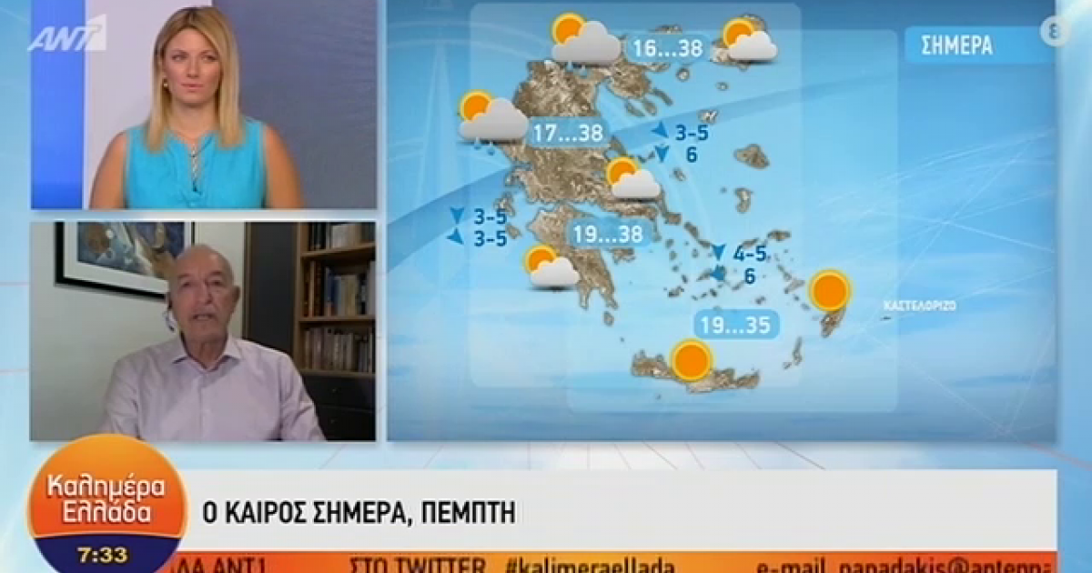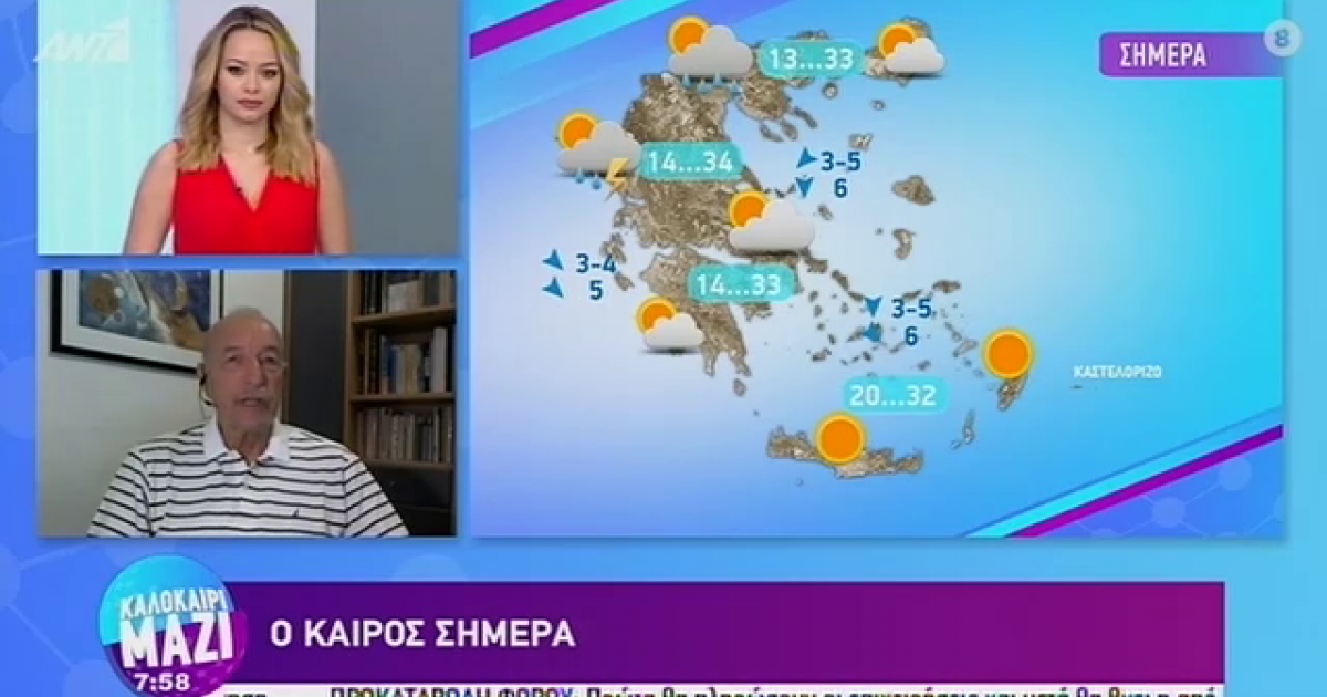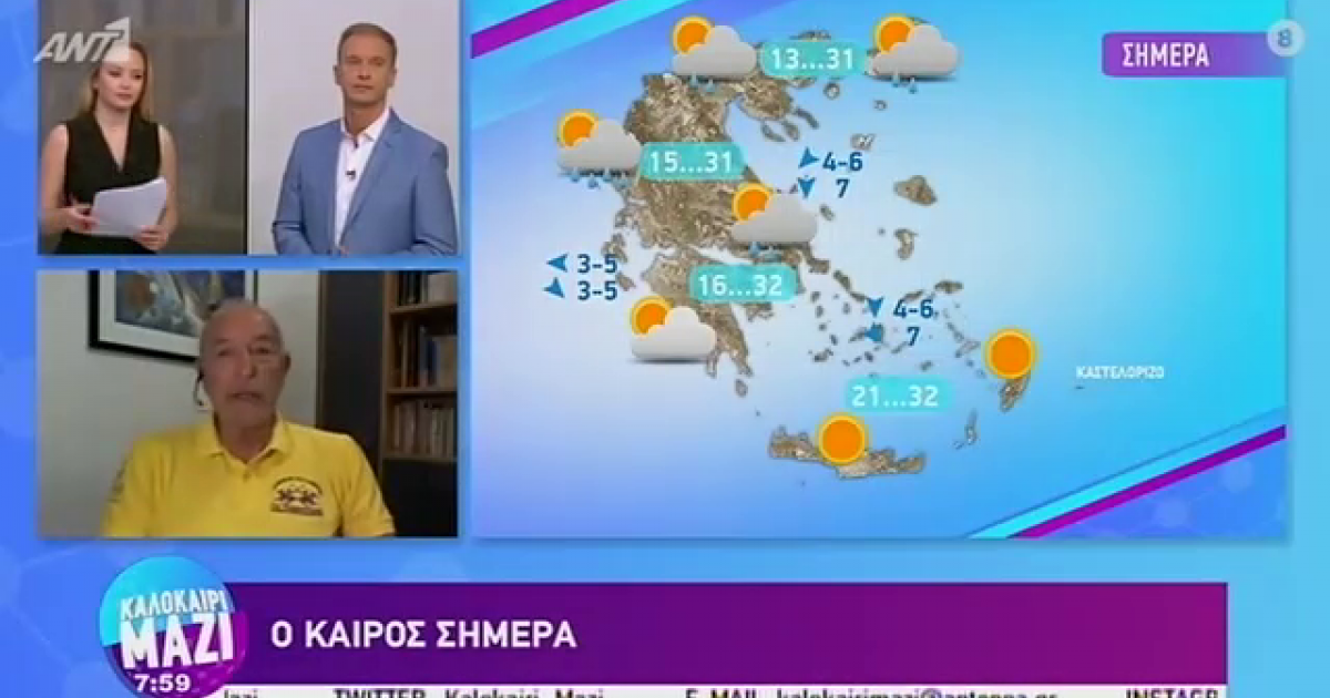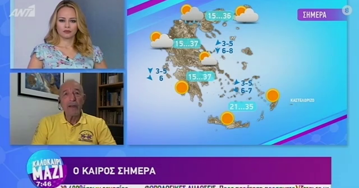 Ο Τάσος Αρνιακός παρουσιάζει τον καιρό στην εκπομπή «Καλημέρα Ελλάδα». "Ζεστή μέρα και η σημερινή, αλλά είναι η τελευταία μέχρι και αύριο" είπε  χαρακτηριστικά. Δείτε όσα είπε για τη σημερινή ημέρα