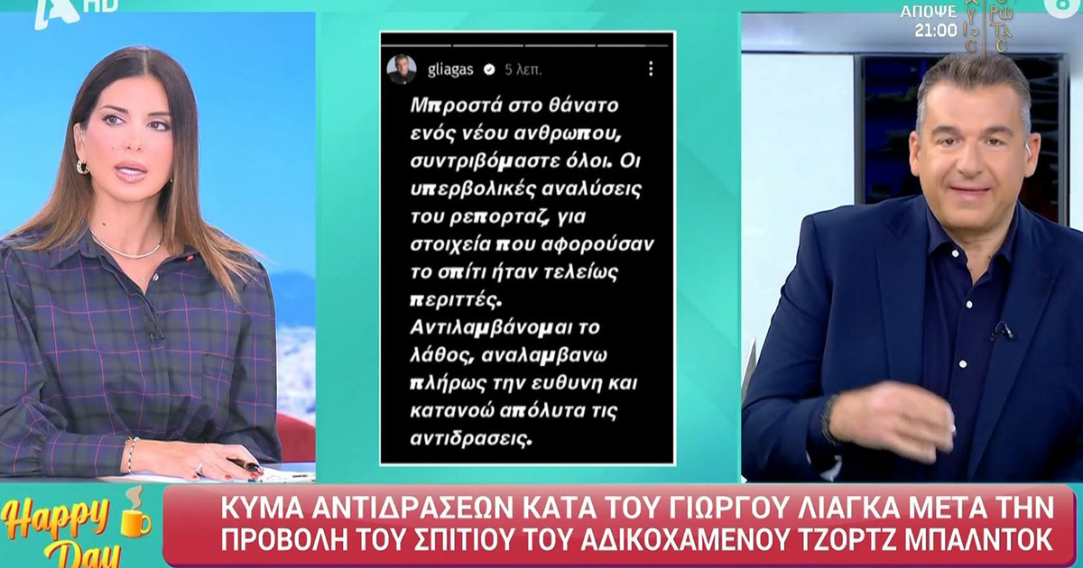 Αντιδράσεις προκάλεσε το ρεπορτάζ της εκπομπής του Γιώργου Λιάγκα, «Το Πρωινό», σχετικά με το σπίτι που νοίκιαζε στα νότια προάστια, ο 31χρονος ποδοσφαιριστής του Παναθηναϊκού, Τζορτζ Μπάλντοκ, ο οποίος βρήκε τραγικό θάνατο στην πισίνα του, το βράδυ της Τετάρτης 9/10. Ο παρουσιαστής του ΑΝΤ1 εστίασε σε πολλές λεπτομέρειες που αφορούσαν το σπίτι του ποδοσφαιριστή του Παναθηναϊκού, αλλά και οικονομικά στοιχεία του συγκεκριμένου ακινήτου. Ο Γιώργος Λιάγκας, μάλιστα, παραδέχτηκε ότι κάτι τέτοιο ήταν λάθος και απολογήθηκε με ένα μήνυμα στο Instagram. Η Σταματίνα Τσιμτσιλή τοποθετήθηκε για το θέμα σημειώνοντας ότι ήταν λάθος αυτό που έγινε και η Τίνα Μεσσαροπούλου αποκάλυψε πως, σύμφωνα με το ρ