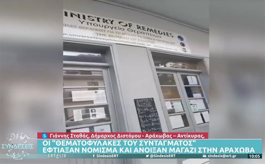 Οι αυτοαποκαλούμενοι «Θεματοφύλακες του Συντάγματος», οι οποίοι έγιναν πρόσφατα γνωστοί μετά την εισβολή τους σε διαγνωστικό κέντρο στη Θεσσαλονίκη ζητώντας να κάνουν έλεγχο για τα rapid test, έχουν ανοίξει κατάστημα στην Αράχωβα, με την ονομασία… υπουργείο θεραπείας. Σύμφωνα με την ΕΡΤ, πρόκειται για ένα κατάστημα που προσφέρει από φυσικές «θεραπείες» με γαϊδουράγκαθο και φασκόμηλο για το μυαλό, το σώμα και την ψυχή μέχρι… δωρεάν rapid test σημειώνοντας ότι εκεί δεν υπάρχει νόμος για τον κορονοϊό. «Είχαν φέρει εμβόλιο σε… σπρέι» Όπως ανέφερε ο δήμαρχος Διστόμου – Αράχωβας, Γιάννης Σταθάς, είπε πως τα άτομα αυτά δραστηριοποιούνται στην περιοχή τα δύο τελευταία χρόνια, εν