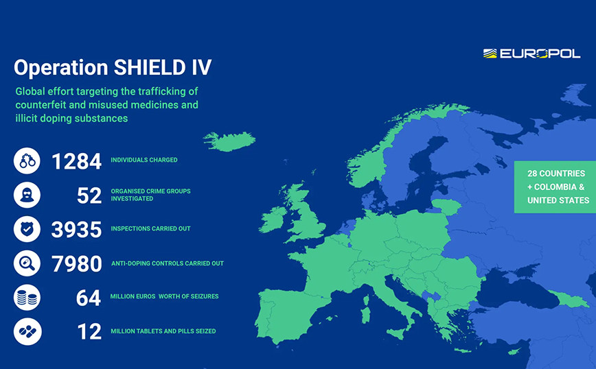 Η ΕΛ.ΑΣ. πήρε μέρος στην ευρωπαϊκή επιχείρηση SHIELD IV για την αντιμετώπιση της διακίνησης παραποιημένων φαρμάκων και ουσιών ντόπινγκ, που έγινε υπό τον συντονισμό της Europol και την ηγεσία των γαλλικών, ισπανικών και ιταλικών αρχών. Σύμφωνα με τη σχετική ανακοίνωση η δράση υλοποιήθηκε το διάστημα από τον Απρίλιο μέχρι τον Οκτώβριο του 2023, με τη συμμετοχή αρχών επιβολής του νόμου από 30 χώρες σε τρεις ηπείρους, τη συνδρομή της Ευρωπαϊκής Υπηρεσίας Καταπολέμησης της Απάτης (OLAF), του Γραφείου Πνευματικής Ιδιοκτησίας της Ευρωπαϊκής Ένωσης, της INTERPOL, της EUROJUST, της FRONTEX, του Παγκόσμιου Οργανισμού Τελωνίων (WCO), του Παγκόσμιου Οργανισμού Αντιντόπινγκ (WADA), καθώς και ιδιωτικώ