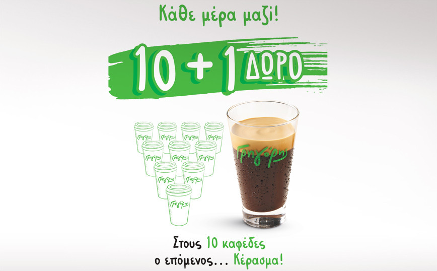 Αυτό το καλοκαίρι, ο Γρηγόρης μας κερνάει τον καφέ της αρεσκείας μας και δίνει σε όλους εμάς, που «είμαστε του καφέ», ένα ακόμα λόγο για να χαμογελάσουμε! Με την ενέργεια «Κάθε μέρα μαζί», στους 10 καφέδες που αγοράζουμε από το κατάστημα Γρηγόρης της γειτονιάς μας, κερδίζουμε ακόμα ένα καφέ δώρο. Όποιο χαρμάνι ή μέγεθος επιλέξουμε κάθε φορά! Από 6 έως 30 Ιουνίου, δηλώνουμε συμμετοχή στο «Κάθε μέρα μαζί», και βγαίνουμε κερδισμένοι. Στη βόλτα, στα ψώνια, στην παραλία, ή καθοδόν για το σπίτι ή το γραφείο, κάνουμε μία στάση στον Γρηγόρη, συλλέγουμε καφέδες και απολαμβάνουμε το κέρασμά μας! Η ενέργεια αφορά αγορές μέσω take away στα καταστήματα που φέρουν την ειδική σήμανση και το μόνο που