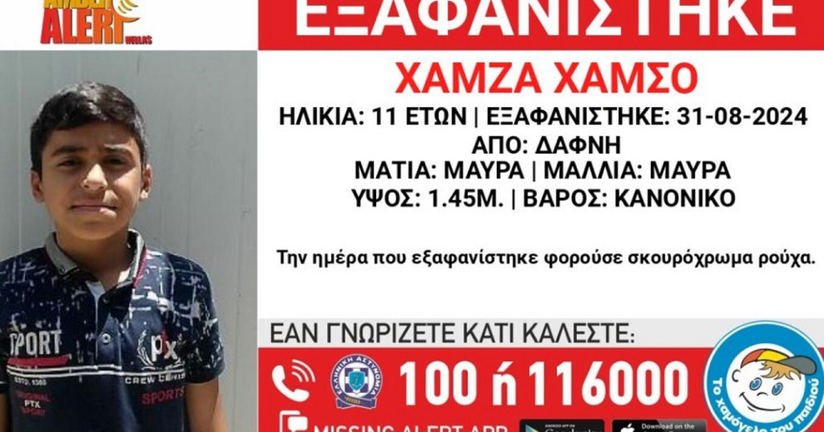 Συναγερμός σήμανε στις αρχές μετά την εξαφάνιση του 11χρονου Xάμσο Χάμζα από χώρο παιδικής προστασίας στη Δάφνη. Η ανακοίνωση του Χαμόγελου του Παιδιού αναφέρει: Στις 31.08.2024, πρωινές ώρες, εξαφανίστηκε από χώρο παιδικής προστασίας στην Δάφνη, ο Hamsho (Xαμσο) (επ.) Xamza (Χάμζα) (ον.), 11 ετών, συριακής καταγωγής. «Το Χαμόγελο του Παιδιού» ενημερώθηκε για την εξαφάνιση του ανήλικου σήμερα, 31.08.2024, και προχώρησε άμεσα στην ενεργοποίηση του μηχανισμού AMBER ALERT HELLAS, κατόπιν εισαγγελικής εντολής. Ο Hamsho (Xαμσο) (επ.) Xamza (Χάμζα) (ον.), έχει μαύρα μαλλιά, μαύρα μάτια, 1.45 ύψος και κανονικό βάρος. Την ημέρα που εξαφανίστηκε φορούσε σκουρόχρωμα ρούχα. Οποιοσδήποτε έχει κάποια