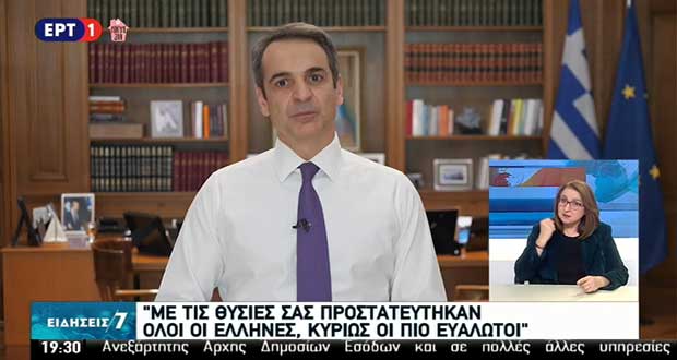 Διάγγελμα Μητσοτάκη: Ανοίγουν σχολεία και επιχειρήσεις με βήματα σταθερά (video) Ο Κυριάκος Μητσοτάκης πριν από λίγο έβγαλε διάγγελμα για τον κορονοϊό που πλήττει τη χώρα μας και τα μέτρα που παίρνει η κυβέρνηση. Συμπολίτες μου, Έχουν περάσει ήδη 33 μέρες από το πρώτο μήνυμά μου για την πανδημία. Έθεσα, τότε, έναν σαφή στόχο: Να περιορίσουμε την εξάπλωση του κορονοϊού στη χώρα, υπομένοντας και ατομικές θυσίες. Και αυτές τις θυσίες τις κάνατε, με υψηλό αίσθημα ευθύνης. Προστατεύτηκαν, έτσι, όλοι οι Έλληνες, κυρίως, όμως, οι πιο ευάλωτοι. Και κερδίσαμε πολύτιμο χρόνο, ώστε να οργανώσουμε καλύτερα το Εθνικό Σύστημα Υγείας. Σας αξίζει ένα μεγάλο ευχαριστώ. Για την εμπιστοσύνη, αλλά και την πειθαρχη