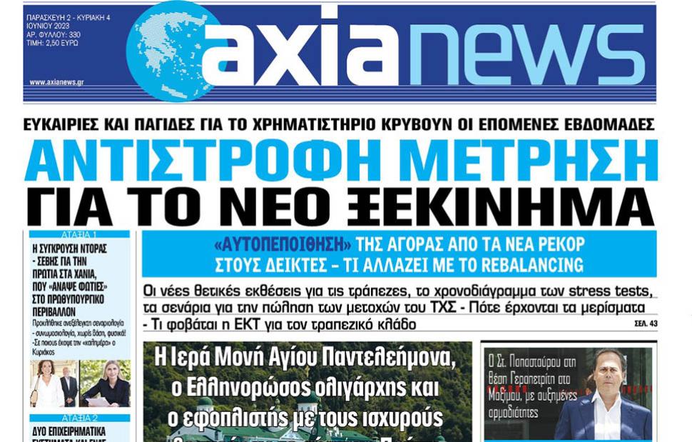 Με τίτλο: «Αντίστροφη μέτρηση για το νέο ξεκίνημα» κυκλοφορεί εκτάκτως αύριο, Παρασκευή 2 Ιουνίου, η «Axianews». Ευκαιρίες και παγίδες για το Χρηματιστήριο κρύβουν οι επόμενες εβδομάδες